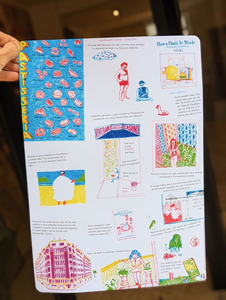 El resultado es Novedades Casino – El Boletín, una hoja dibujada y escrita a mano donde Pablo recoge escenas cotidianas, hallazgos y pequeñas obsesiones. Cuenta cosas como que el cartel de Patisseria, encontrado en Alcoi, fue el hit de las últimas semanas; que en el pingüino donde guarda las propinas lleva recogidos 19 euros, 94 céntimos y un franco suizo; que aún le hace ilusión cuando alguien manda una postal desde lejos, incluso si le pegan una dirección encima. También hay homenajes, como el que dedica a Ricardo Cases y su nuevo libro, y observaciones tipo ‘cosas que todo el mundo dice que le encantan pero que nadie ha comprado nunca’, sacadas de un manual de 1980 llamado Decorative Napkin Folding for Beginners.
